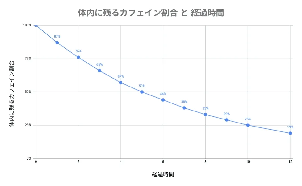 以下は、カフェインの半減期を約5時間と仮定した場合の、