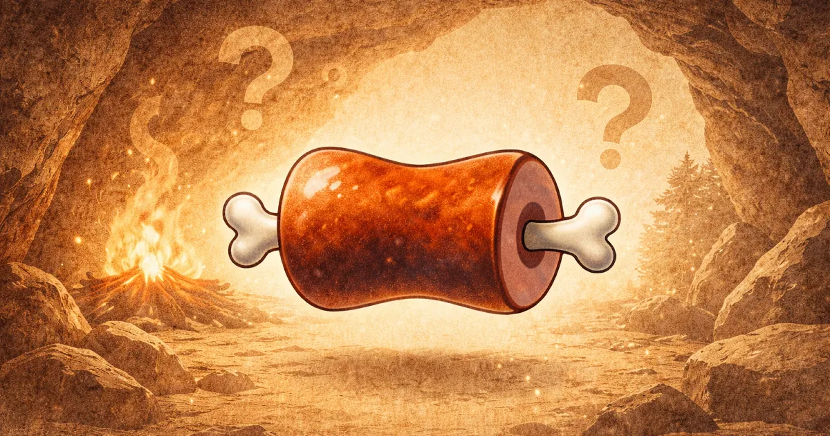 特定の料理というより、原始人イメージや海外イラスト表現の影響が大きいと考えられています。