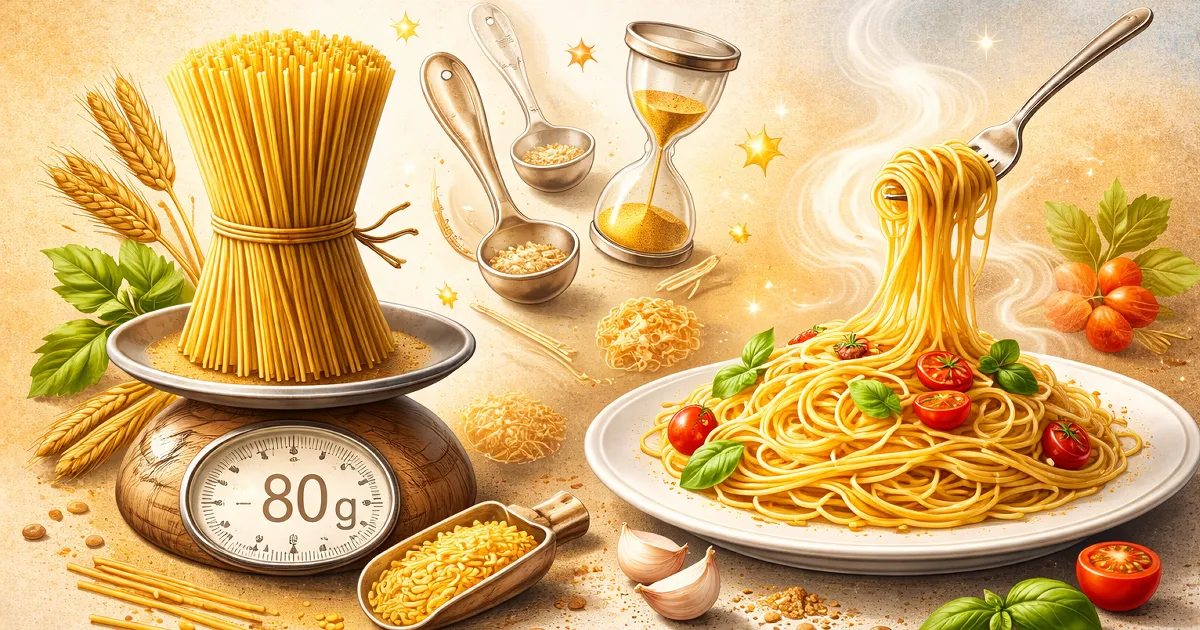 乾燥パスタ80gは、茹でると水分を吸収し、